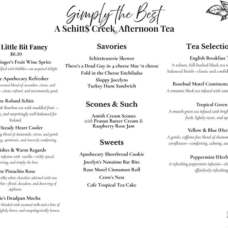 Each guest may choose their own pot of tea. Guests may choose to enhance their experience with handcrafted coffee and espresso drinks, as well as seasonally inspired, non-alcoholic libations thoughtfully created to complement the menu and mood.